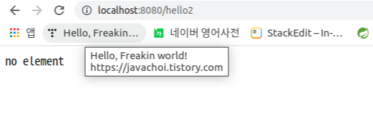 이제 앱을 시작해서 http://localhost:8080/hello 입력해서 일단 어떤 화면이 나오는지 관찰합니다.