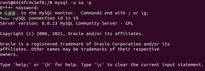 db 컨테이너의 쉘에 접속했다면 mysql username, password 를 이용해 mysql에 연결한다.