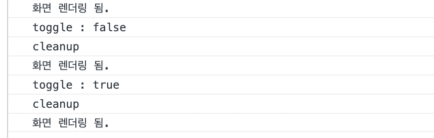 크롬 콘솔을 통해 toggle 값이 변하면서 렌더링 전에 cleanup이 콘솔에 찍히는걸 확인할 수 있습니다.